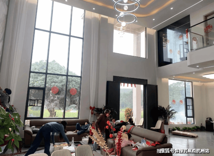从铝合金窗可以看出,客厅也是一个两层中空的设计,因为入户大门右侧是一个连通一楼和二楼的大窗户,虽然左侧不是连通的窗户,但是通过把窗户的顶和底对齐,再装上窗套线,也能做到左右对称。