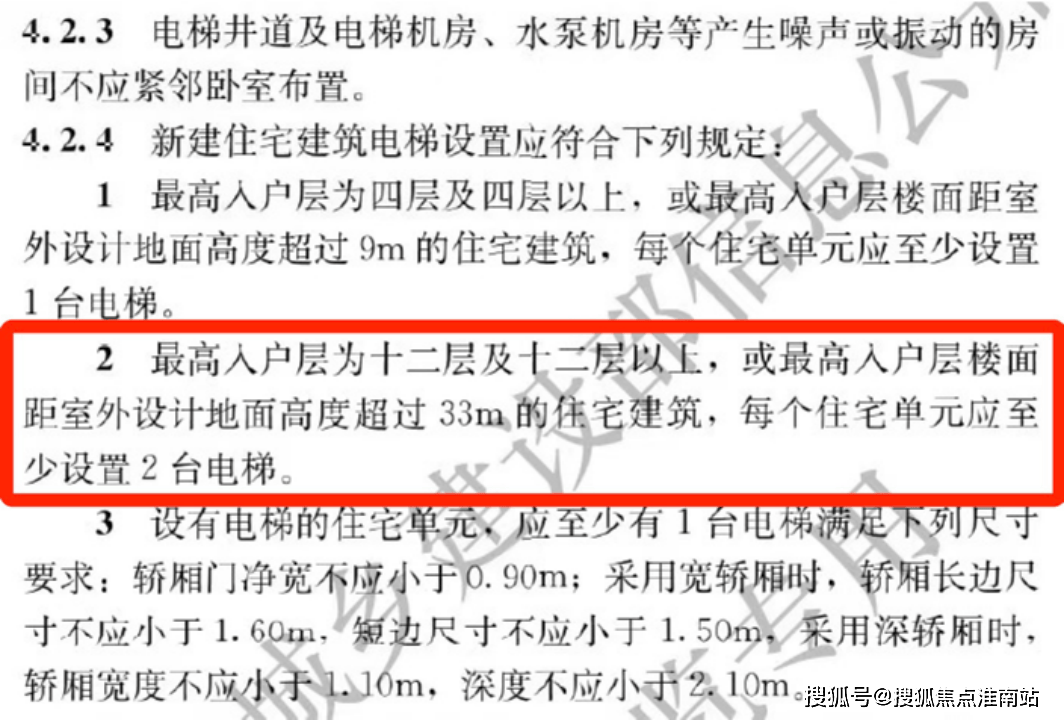 ② 5.1起执行住宅新国标,最高入户层为十二层及十二层以上,或最高入户层楼面距室外设计地面高度超过33m的住宅建筑,每个住宅单元应至少设置2台电梯。