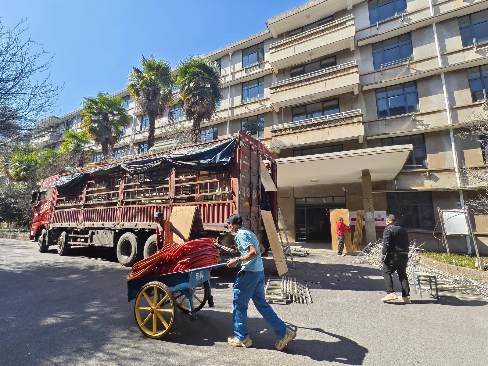 沿着院内道路往里走,记者看到工人们正忙着将现有三栋宿舍里的所有高低床架子和床板往外搬运。这些床铺是浅灰色新型号,可以反复拆装使用。记者上前询问得知,这些还能使用的床铺将被运往临沧,继续在其他学校发挥余热。