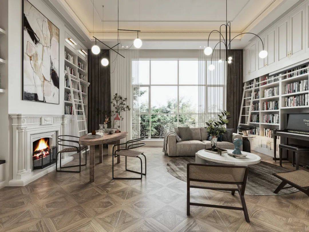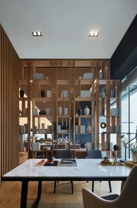 最常见的做法,就是把大书架规划在客厅和餐厅之间,这样两个区域都能以最近的距离到达书架。开放式书架,不会影响正常采光,还能在上面摆放一些装饰品,提升空间的层次感。
