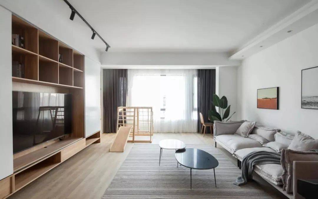 电视墙书柜:客厅定制了一整面墙的收纳柜,将电视柜和书柜组合设计,一举两得。