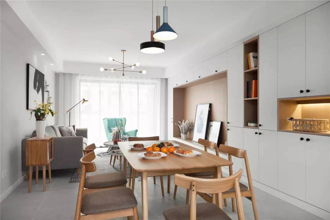 餐厅可以定制一个餐边柜,预留一部分空间充当书柜。在小户型中,餐边柜与书柜合二为一,非常省空间。
