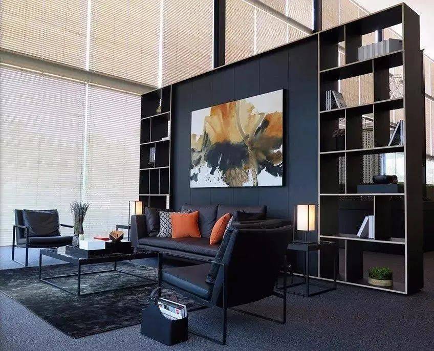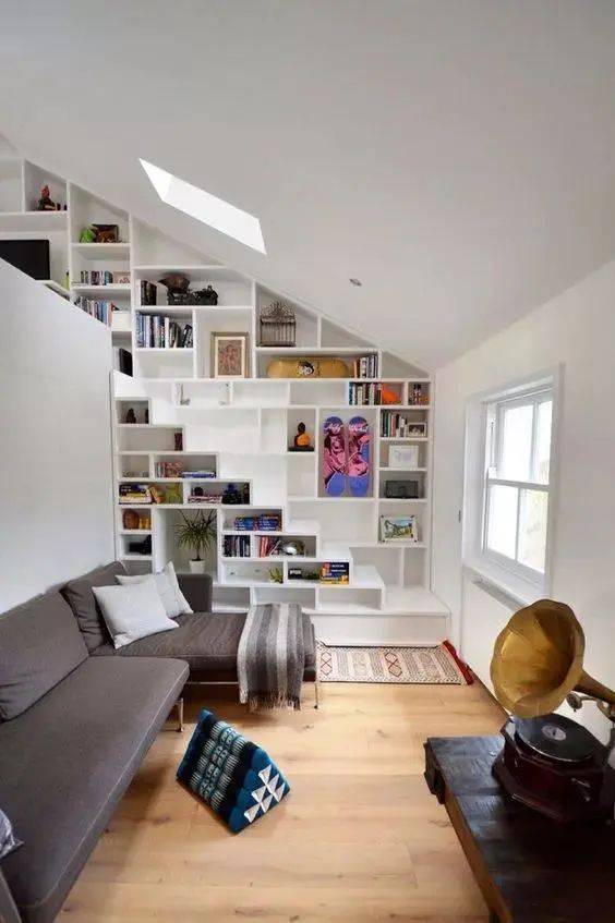 沙发墙书柜:客厅沙发背景墙上可以装一个书柜,内嵌设计更省空间。旁边搭配落地灯,平时可以坐在沙发上看书阅读。